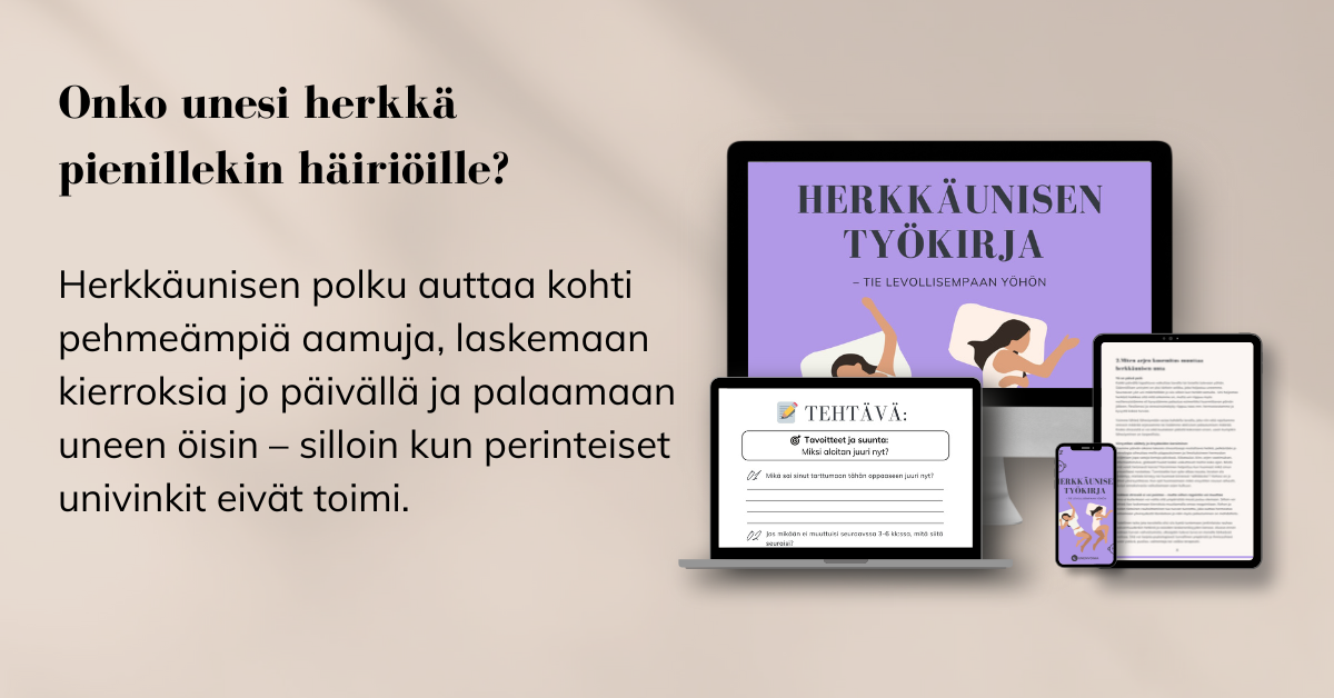 Herkkää unta ei voi korjata lisäämällä sääntöjä tai yrittämällä kovempaa. Tarvitaan lähestymistapa, joka auttaa sinua näkemään, mistä juuri sinun heikko unenlaatusi syntyy ja miten voit tukea untasi tavalla, joka ei kuormita lisää.